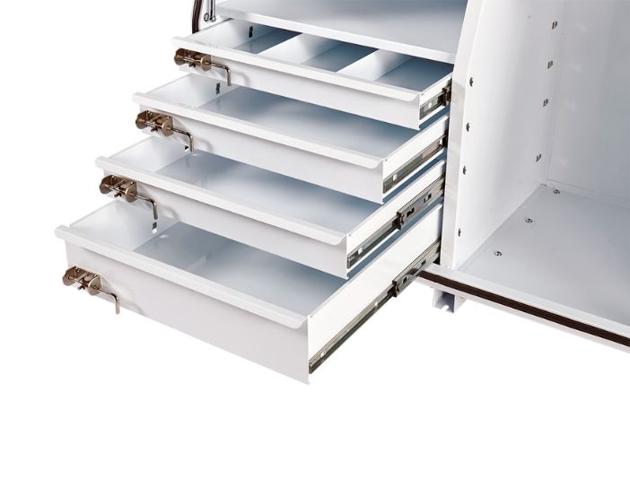 The 950 Series - 4 Drawer Minebox offers versatile storage by blending secure drawers with open compartments. Store small tools and parts safely in the built-in drawers, while larger equipment and power tools fit easily in the open section. Crafted from durable 1.5mm steel sheet with a fully opening door and secured by two whale tail locks, this minebox keeps your gear organized and protected, making it an essential addition for efficient workspace management.